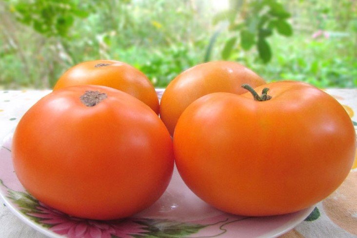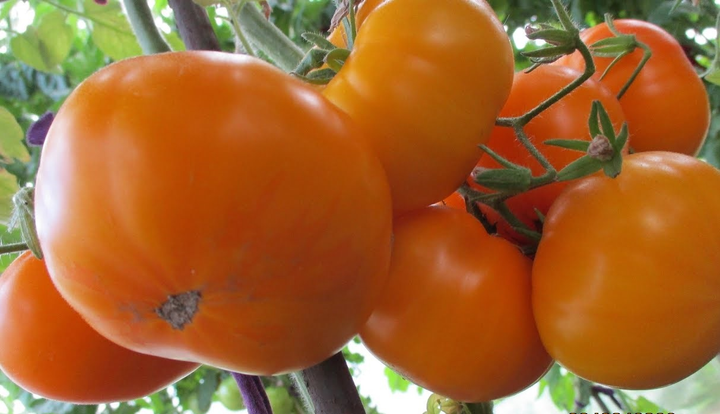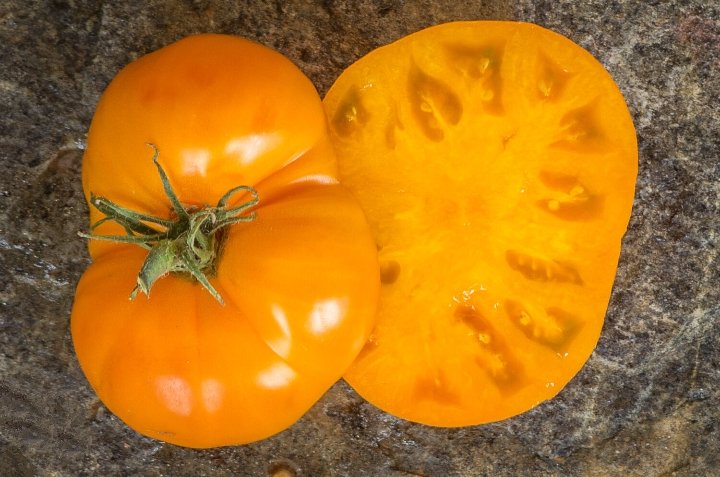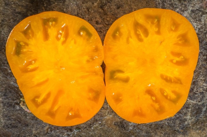صنف متوارث طُرِحَ لأول مرة عام 2014م. فهو ناتج من تهجين صنفَي Golden Dwarf Champion وElbe Tipsy. الثمار مسطحة وناعمة، مستديرة، صفراء داكنة عند النضج، مع لون برتقالي مشع (ومن هنا جاء اسمه). طماطم كبيرة ومتوسطة الحجم، تزن 150-180 غرامًا، بطعم قويّ ومتناغم، مع حموضة مميزة ورائحة طماطم غنية وقوية. أفضل رائحة بين جميع أنواع الطماطم القزمية. الصنف ينضج في منتصف الموسم (75 يومًا من زراعة الشتلات)، الصنف محدود النمو ويصل ارتفاعه إلى متر واحد، وبأوراق بطاطا كبيرة. الصنف عالي الغلة، طويل الإثمار. يتطلب الربط والتثبيت.